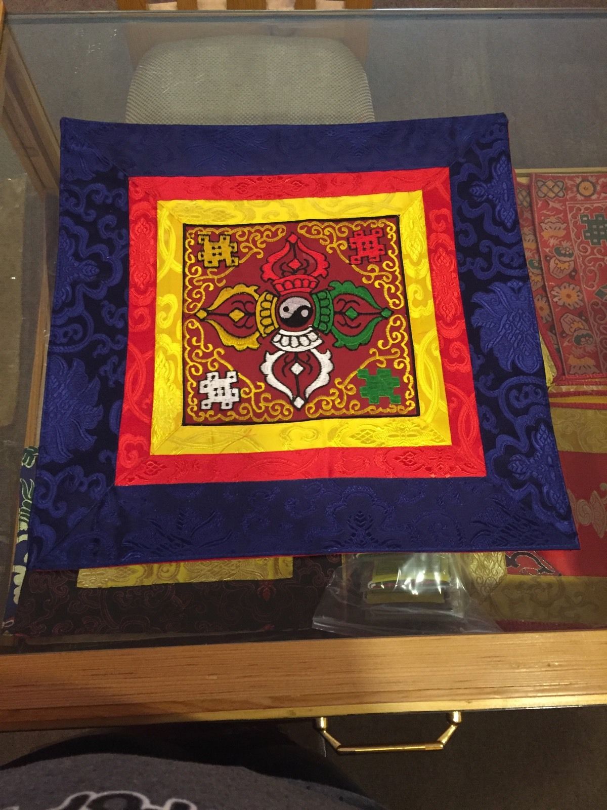 Beautiful multi colored silk brocade cushion cover with double dorje design. Zippered back so that you can insert your own cushion. Way to refresh the mind with sacred beauty is to adorn your shrine or living room with cushions. Our cushion covers depicting sacred symbols.
